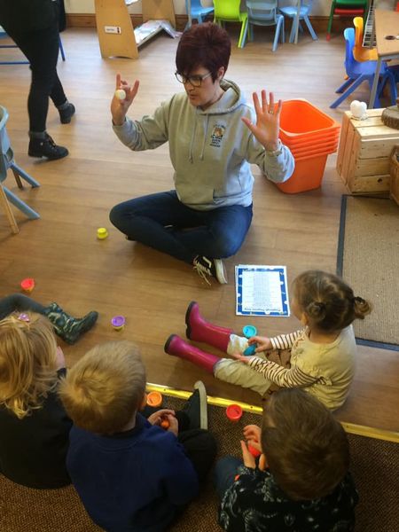 It involves moulding playdough to songs and music by performing actions such as squeezing, rolling, pinching and patting.