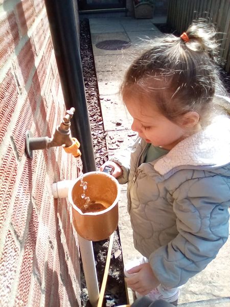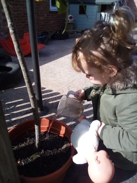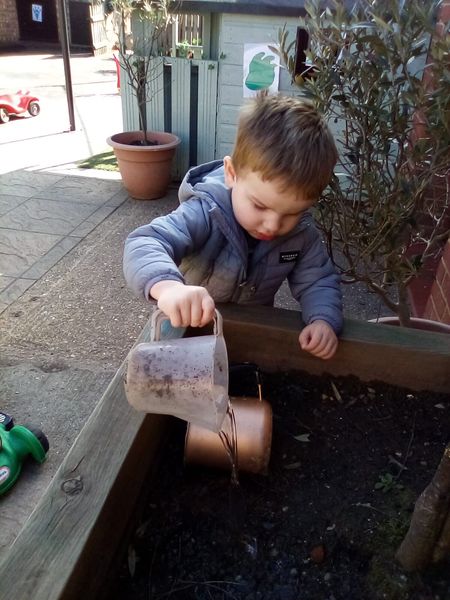 Outside this morning Snowy Owls found jugs they could fill up with the practitioner and found our plants around the garden to water. The children used good listening and followed instructions well from the practitioner. The children used there dominate hand to water the plants